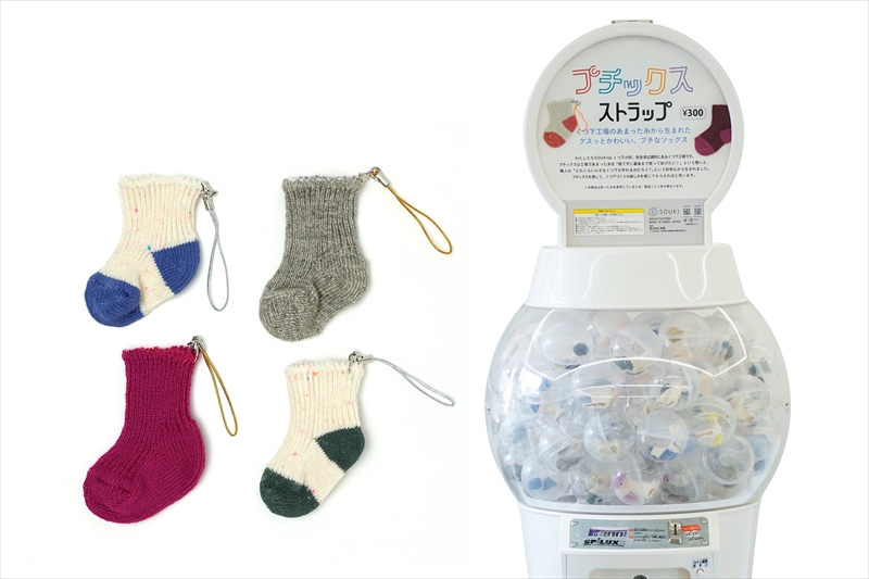 工場で眠っていたベビー用ソックス編み機と、通常は廃棄される残糸を活用したエコフレンドリーなアイテム「プチックス」。手のひらに収まるプチサイズでキーホルダーやバッグチャームとしてお使いいただけます。